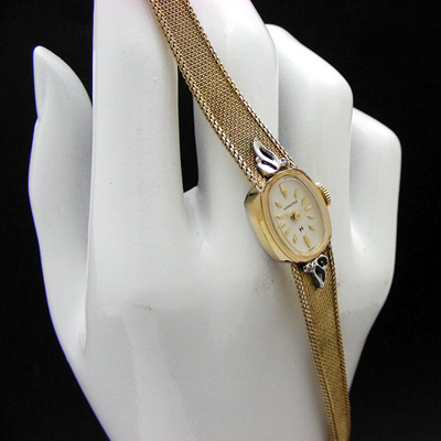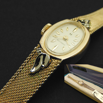 ハミルトンのアンティークウオッチです。ダイヤ型のインデックスにケースと一体型のメッシュベルトはゴールドカラー、そこに天使の羽のようなシルバーのラグがあしらわれた実に可憐な印象の、ハミルトンの手巻き腕時計です。(さらに詳しく)