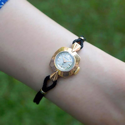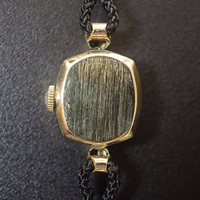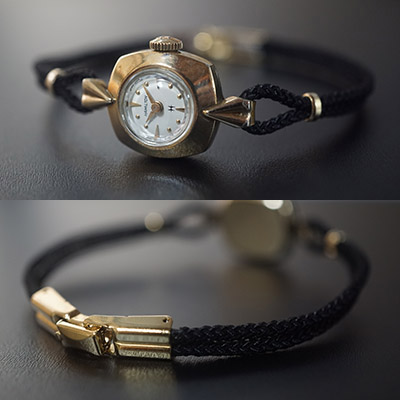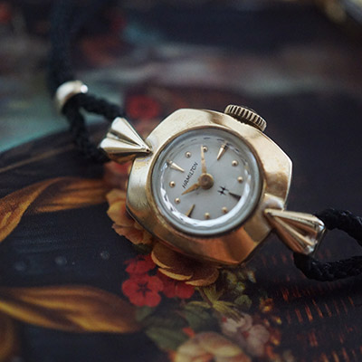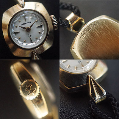 ハミルトンのヴィンテージレディースウオッチです。ハミルトンは、100年以上の歴史を誇るアメリカ発祥の老舗時計メーカーです。その洗練されたデザインには定評があり、創業時よりレディースウオッチに力を注いでおり、アンティーク腕時計でも人気のブランドのひとつです。丸みをおびた四角いフェイスと丸いプリズム風防がキュートなイメージの手巻きモデル。10KGFのケースと同様、丸みを帯びたデザインのインデックスは、女性らしい柔らかな印象を与えます。