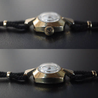 古い物ですのでケースには経年に伴う若干のスレやコキズはありますが、雰囲気を損なう致命的なキズはありません。動作確認調整済みのムーブメントは問題なく動作しており、しばらくはメンテナンスの必要がありません。腕時計の正確さは姿勢や利用環境によって異なりますが、1日に60秒内外のずれに収まっています。ベルト、尾錠は社外品です。いずれも未使用ですが、多少の経年変化はみられます。ケースの大きさは縦横約17×16mm(ラグ・竜頭は除きます)。腕回りは紐の長さで調整可能です。