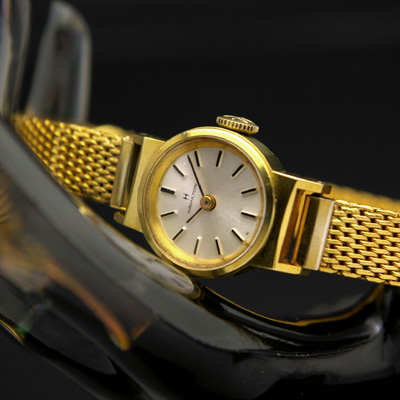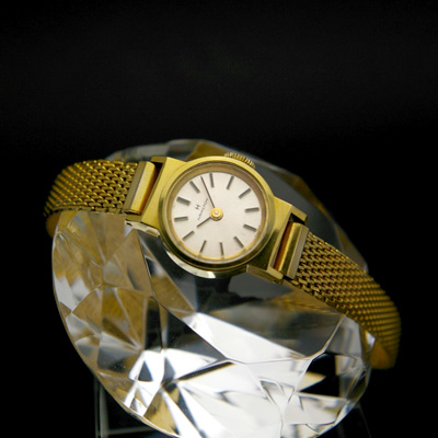 ゴールドで統一したケースとメッシュベルト、くっきりと浮かび上がる棒状のインデックス。シンプルな中に強い個性を秘めた潔いデザインです。同時にアンティークならではの小さめのフェイスやなめらかな質感の文字盤により、女性の艶やかさ、気高