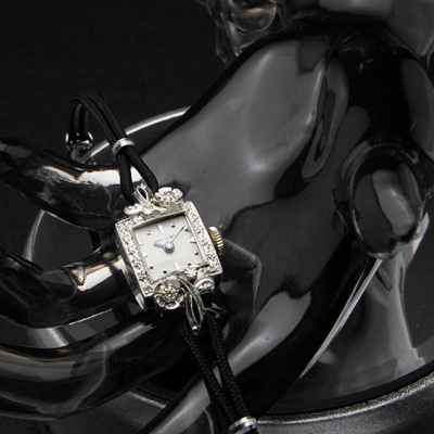 白ベースの文字盤に控えめにブランド名やインデックス(「時」をあらわすマーク)を描いています。小振りなホワイトゴールドのスクエアケースに花をモチーフにしたデザインのラグ(ベルト取り付け部分)を大胆に配し、要所をダイヤモンドで華麗に装飾。小さいケースサイズも相まってアクセサリーとしての要素が強くなっています。