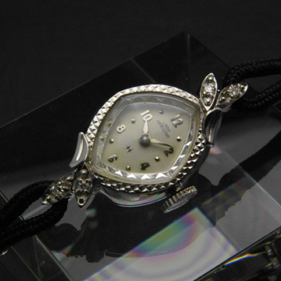 偶数時のみアラビア数字で表現したインデックス(時を表すしるし)はビンテージ感満点。キラキラと輝くプリズム風防と経年変化により落ち着いた色になっている白文字盤とのギャップはアンティーク時計ならではの魅力です。ケースは価値ある14Kホワイトゴールドです。ホワイトゴールドの上質な輝きは他の金属では表現できません。ラグ(ベルトを止める部分)デザインは有機的なリーフモチーフです。各ラグに2粒づつあしらわれた大きめのダイヤが可憐に輝き、アクセサリーとしても存在感のある時計です。