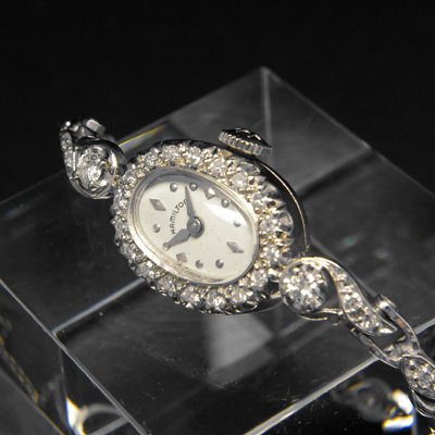 ハミルトンの手巻き腕時計です。ハミルトン社は1892年に創業、100年以上の歴史をもつ時計メーカーです。伝統的な技法を重んじるスイスの時計作りとは全く異なったアプローチで画期的な腕時計を次々と世に送り出し、時計史のみならず工業史にもその名を刻む時計メーカーとなりました。今回ご紹介するのはブレスレットにもダイヤ装飾が施された豪華な腕時計です。