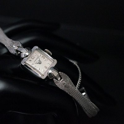 シルバーで統一されたカラーリング。お仕事からカジュアル、ドレスアップしたときまで、着けるシチュエーションを選びません。メッシュのベルトにはリボンのような意匠が施されており、アクセサリーライクに仕上がっています。装着感も折り紙付き。今、注目されつつある「アンティーク風」腕時計とも、またブランド名ゆえに必要以上に価格の高いブランドウオッチとも違う、本物の価値がわかる貴女に。初めての機械式時計、初めてのアンティーク時計におすすめです。