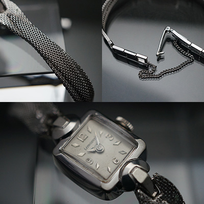 ロンジン社のアンティークウオッチです。全体がシルバーで統一され、シンプルなデザイン。小さめのスクエアフェースが女性らしい、アクセサリーライクな腕時計です。